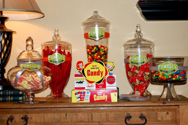 After using the picture that I did for his invitation, I ordered candy cigarettes (good ol' Amazon!)...and then filled the jars with all of Powell's favorite candies!
